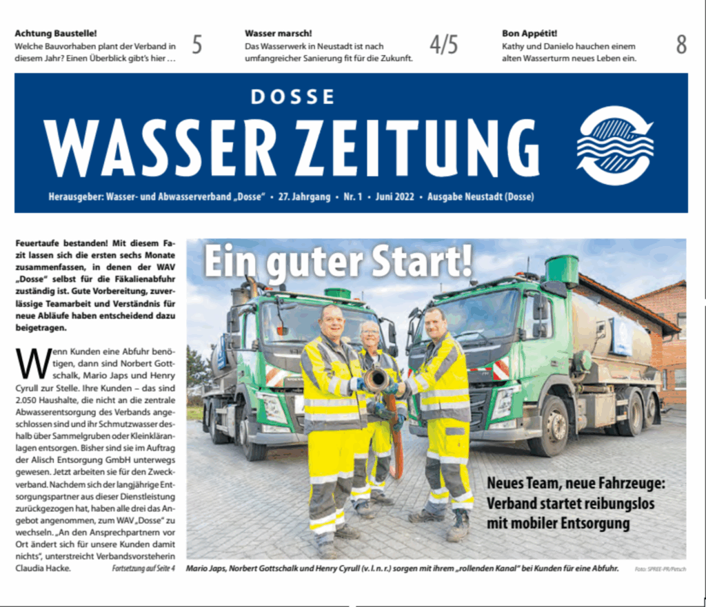 Feuertaufe bestanden! Mit diesem Fazit lassen sich die ersten sechs Monate zusammenfassen, in denen der WAV „Dosse“ selbst für die Fäkalienabfuhr zuständig ist. Gute Vorbereitung, zuverlässige Teamarbeit und Verständnis für neue Abläufe haben entscheidend dazu