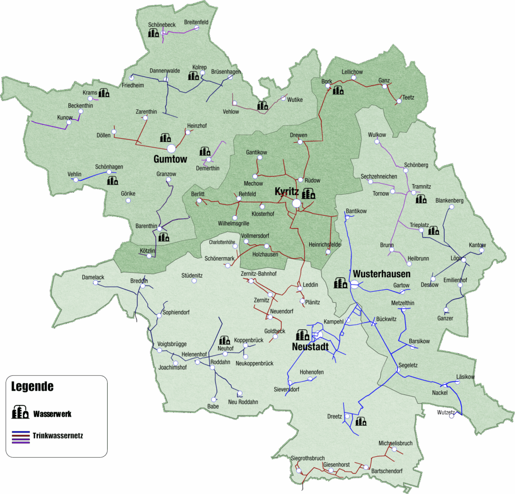 Leistungspass Trinkwasserversorgung 16 Wasserwerke 435 km Trinkwasserleitung9649 Trinkwasserhausanschlüsse1 DruckerhöhungsstationWasserförderung: 1.428.000 m³/a Karte ist durch anklicken vergrößerbar Schmutzwasser Zentralkläranlage Neustadt – Kampehl (30.000EW)Kläranlage Gumtow (2500 EW)Kläranlage Plänitz-Leddin (250 EW)Kläranlage Teetz-Ganz (300 EW)Kläranlage Döllen (220 EW)Kläranlage Kunow (450 EW)Kläranlage Schönebeck (170 EW)425 Abwasserpumpwerke136 km Schmutzwasserkanalnetz150 km Abwasserdruckleitungen7.700 Schmutzwasserhausanschlüsse (zentral)2.010 Sammelgruben530 KleinkläranlagenAbwasseranfall auf Kläranlagen (zentral): 1.050.000 m³/aEntsorgte Menge Fäkalwasser: 58.200 m³/a Karte ist durch anklicken vergrößerbar